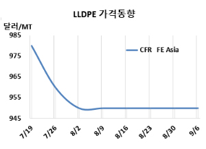 LLDPE 시세는 9월4일 CFR FE Asia가 톤당 950달러로 변동이 없었고, CFR SE Asia는 975달러로 10달러 하락했다. CFR S Asia는 950달러로 변동이 없었다. 유럽도 9월6일 톤당 FD NWE 1210유로로 보합세에 그쳤다.