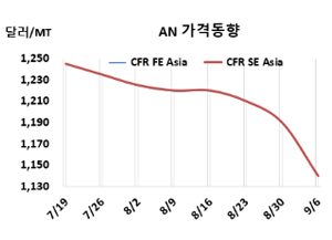 ![]() AN 시세는 9월6일 CFR FE Asia 1140달러, CFR SE Asia도 1140달러로 각각 50달러씩 폭락했고, CFR S Asia는 1160달러로 10달러 떨어졌다.