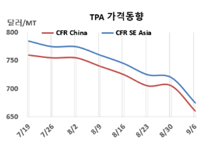 PTA(Purified Terephthalic Acid)는 하락했다. PTA 시세는 9월6일 CFR China가 톤당 660달러, CFR SE Asia는 675달러로 각각 45달러 하락했다. CFR India는 725달러로 50달러 떨어졌다. CFR China는 2021년 12월3일 642달러를 형성한 이후 약 33개월만에 최저치를 형성했다. 표, 그래프: <TPA 가격동향> <화학저널 2024/09/12> |