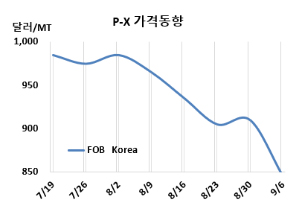 P-X(Para-Xylene)는 폭락했다. P-X 시세는 9월6일 FOB Korea가 톤당 845달러, CFR SE Asia는 865달러로 각각 65달러 폭락했다. CFR Taiwan도 875달러로 60달러 떨어졌다. 유럽은 FOB Rotterdam 995달러로 5달러 하락했다. FOB Korea는 2021년 12월24일 841달러를 형성한 이후 약 32개월만에 최소치를 형성했다. 표, 그래프: <P-X 가격동향> <화학저널 2024/09/13> |