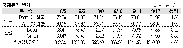 9월12일 국제유가는 허리케인 상륙으로 미국의 원유 생산이 감소해 상승했다.