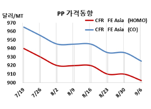 원료 프로필렌(Propylene)은 9월3일 CFR China 톤당 860달러, FOB Korea는 835달러로 각각 5달러 하락했다. PP(라피아: CFR FE Asia)와 프로필렌(CFR China)의 스프레드는 톤당 20달러로 18달러 줄어들었고, 손익분기점 150달러를 크게 밑돌아 적자가 심화되고 있는 것으로 분석된다.