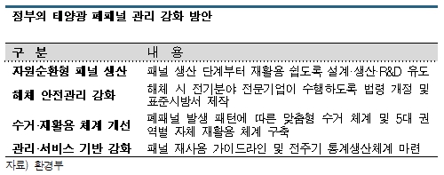 정부는 국무조정실, 환경부, 산업부 등 관계부처를 중심으로 폐패널 발생 증가에 대비하고 재활용을 촉진하기 위해 태양광 패널의 생애 전주기를 고려한 태양광 폐패널 관리 강화 방안을 마련했다.