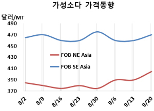 가성소다 시세는 9월20일 FOB NE Asia가 톤당 405달러로 15달러, CFR SE Asia는 470달러로 10달러 상승했다.