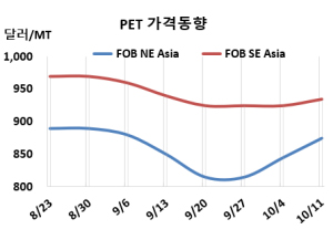 병(Bottle) 그레이드 PET 시세는 10월9일 FOB NE Asia가 875달러로 30달러, FOB SE Asia는 935달러로 10달러 상승했다. CFR S Asia도 920달러로 20달러 올랐다. 유럽은 10월11일 FD NWE가 톤당 1100유로