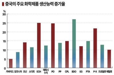 특히, 폴리에스터(Polyester) 원료 P-X(Para-Xylene), 반도체 봉지재에 사용하는 에폭시수지(Epoxy Resin) 원료 ECH(Epichlorohydrin), 우레탄(Urethane)과 의약품 등 광범위한 용도에서 사용하는 PO(Propylene Oxide), 생분해성 수지와 스판덱스 원료로 사용되는 1,4-BDO(Butanediol) 등 4개 품목은 생산능력 증가율이 20%를 넘은 것으로 나타났다.