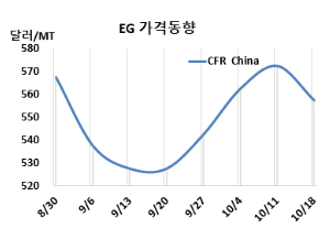 MEG(Monoethylene Glycol)는 하락했다. MEG 시세는 10월18일 CFR China가 톤당 558달러로 15달러, CFR SE Asia는 563달러로 20달러 하락했다. |
