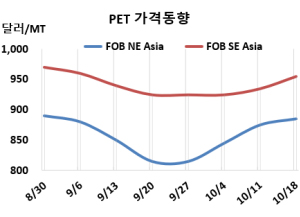 PET(Polyethylene Terephthalate)는 상승했다. 병(Bottle) 그레이드 PET 시세는 10월16일 FOB NE Asia가 885달러로 10달러, FOB SE Asia는 955달러로 20달러 상승했다. CFR S Asia는 930달러로 10달러 올랐다. 유럽은 10월18일 FD NWE가 톤당 1080유로로 20유 |