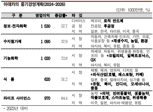 아데카는 2023회계연도(2023년 4월-2024년 3월) 영업이익이 354억엔으로 전년대비 9.4% 증가했으며 2026회계연도까지 영업이익을 530억엔으로 2023년 대비 49.7% 확대하기 위한 새로운 중기경영계획을 실시한다고 발표했다.