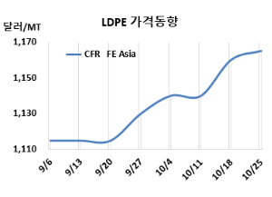 LDPE(Low-Density Polyethylene)는 보합세에 그쳤다. LDPE 시세는 10월23일 CFR FE Asia가 톤당 1165달러로 5달러 상승에 그쳤고, CFR SE Asia는 1175달러로 변동이 없었다. CFR India도 1140달러로 보합세에 그쳤다. 유럽은 10월25일 FD NWE |