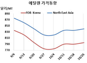 에틸렌(Ethylene)은 보합세에 그쳤다. 에틸렌 시세는 10월25일 CFR NE Asia가 톤당 840달러로 5달러 올랐지만, CFR SE Asia는 940달러로 10달러 하락했다. FOB Korea는 795달러로 5달러 상승에 그쳤다. |