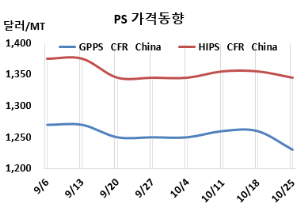 PS(Polystyrene)는 하락했다. GPPS(General Purpose PS) 시세는 10월23일 CFR China가 1230달러, CFR SE Asia는 1265달러로 각각 30달러 하락했다. CFR India는 1280달러로 10달러 떨어졌다. |