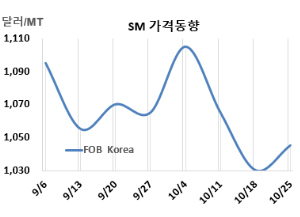 SM(Styrene Monomer)은 상승했다. SM 시세는 10월25일 FOB Korea가 톤당 1045달러, CFR SE Asia는 1095달러로 각각 15달러 상승했다. CFR China는 1065달러, CFR Taiwan은 1095달러, CFR India는 1075달러로 각각 20달러 올랐다. |