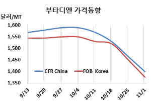 부타디엔 시세는 11월1일 FOB Korea가 톤당 1375달러로 75달러, CFR SE Asia는 1330달러로 60달러 폭락했다. 중화권은 CFR China는 1400달러로 65달러, CFR Taiwan은 1410달러로 60달러 떨어졌다. 한국 시세는