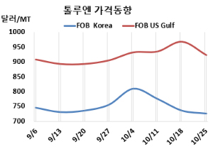 톨루엔(Toluene)은 등락이 엇갈렸다. 톨루엔 시세는 11월1일 FOB Korea가 톤당 730달러로 5달러 상승했지만, CFR SE Asia는 800달러로 변동이 없었다. CFR China는 705달러로 10달러 하락한 반면, CFR India는 830달러로 5달러 올랐다. |
