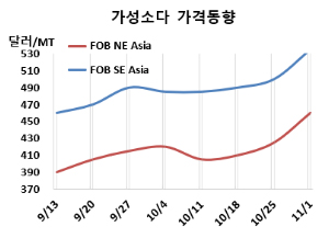 가성소다(Caustic Soda)는 상승했다. 가성소다 시세는 11월1일 FOB NE Asia가 톤당 460달러로 35달러 상승했고, CFR SE Asia는 535달러로 35달러 올랐다. |