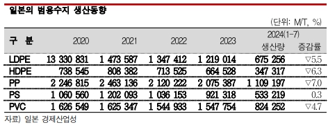 2023년 HDPE(High-Density PE) 생산량이 2019년에 비해 20.0%, LDPE(Low-Density PE)는 16.0%, PP는 15.0% 감소했기 때문이다.