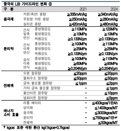 배터리 소재별 생산량당 에너지 소비량 기준을 정한 것으로, 중국 정부가 추진하고 있는 쌍탄목표에 부합하는 내용으로 파악된다.