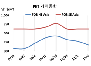 아시아 PET 시장은 국제유가가 배럴당 74달러로 상승한 가운데 공급과잉과 연말 수요 둔화는 하락세로 이어졌다.