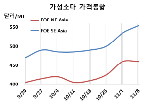 가성소다(Caustic Soda)는 동남아만 올랐다. 가성소다 시세는 11월8일 FOB NE Asia가 톤당 460달러로 변동이 없었고, CFR SE Asia는 555달러로 20달러 올랐다. |