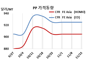 PP(Polypropylene)는 동남아만 하락했다. 아시아 PP 시세는 11월13일 CFR FE Asia 기준 라피아(Raffia) 및 인젝션(Injection) 그레이드가 톤당 905달러, IPP Film 및 BOPP는 910달러, 블록 코폴리머(Block Copolymer)는 925달러로 변동이 없었다. CFR SE Asi |