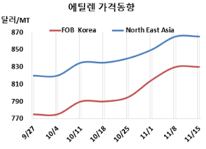 에틸렌(Ethylene)은 동남아만 하락했다. 에틸렌 시세는 11월15일 CFR NE Asia가 톤당 865달러로 변동이 없었지만, CFR SE Asia는 920달러로 20달러 하락했다. FOB Korea는 830달러로 보합세에 그쳤다. |