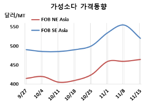 가성소다(Caustic Soda)는 등락이 엇갈렸다. 가성소다 시세는 11월15일 FOB NE Asia가 톤당 465달러로 5달로 올랐으나, CFR SE Asia는 520달러로 35달러 떨어졌다. |