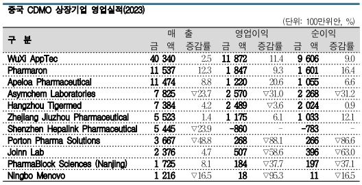 표, 그래프: <중국 CDMO 상장기업 영업실적(2023)>