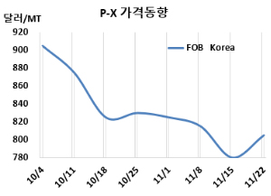 P-X 시세는 11월22일 FOB Korea가 톤당 805달러, CFR SE Asia는 825달러로 각각 25달러 상승했다. CFR Taiwan은 835달러로 20달러 올랐다. 유럽은 FOB Rotterdam 850달러로 변동이 없었다.