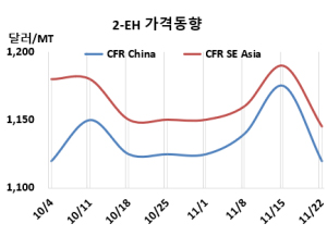 옥소알코올(Oxo-Alcohol)은 하락했다. 2-EH(Ethylhexanol)는 11월22일 CFR China가 톤당 1120달러로 55달러, CFR SE Asia는 1145달러로 45달러 떨어졌다. |