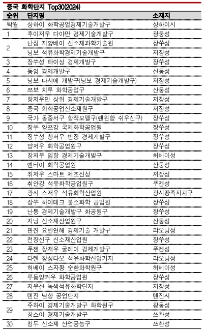 순위에 이름을 올린 화학단지는 2023년 매출액이 4조3000억위안(약 860조원)으로 중국 전체 화학산업 매출액의 27%를, 이익총액은 2139억위안으로 24%를 차지했다.