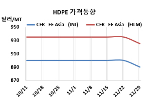 HDPE(High-Density Polyethylene)는 동북아만 하락했다. HDPE 시세는 11월27일 인젝션(Injection) 그레이드 기준 CFR FE Asia가 톤당 890달러로 10달러 하락했고, CFR SE Asia는 950달러로 변동이 없었다. 블로우몰딩(Blow-Molding)도 FEA가 905달러로 10달러 |