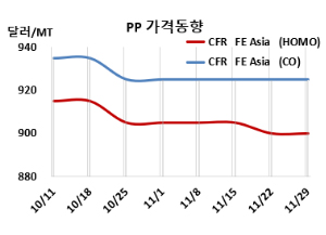 PP(Polypropylene)는 보합세에 그쳤다. 아시아 PP 시세는 11월27일 CFR FE Asia 기준 라피아(Raffia) 및 인젝션(Injection) 그레이드가 톤당 900달러, IPP Film 및 BOPP는 910달러, 블록 코폴리머(Block Copolymer)는 925달러로 변동이 없었다. CFR SE Asi |