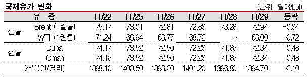 11월29일 국제유가는 중동지역의 지정학적 리스크 완화를 타고 하락했다. 국제유가는 중동지역의 지정학적 리스크가 완화되면서 하락했다 |