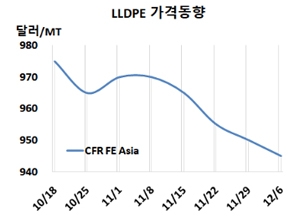 LLDPE(Linear Low-Density Polyethylene)는 하락했다. LLDPE 시세는 12월4일 CFR FE Asia가 톤당 945달러로 5달러, CFR SE Asia는 975달러 10달러 하락했다. CFR S Asia는 930달러로 변동이 없었다. 반면, 유럽은 12월6일 FD NWE 1030유로로 10유로 |