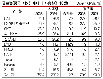 SNE리서치에 따르면, 2024년 1-10월 중국을 제외한 글로벌 각국에 등록된 전기자동차, 하이브리드자동차(HV), 플러그인하이브리드자동차(PHEV) 배터리 사용량은 290.2GWh(기가와트시)로 전년동기대비 12.7% 증가한 것으로 나타났다.