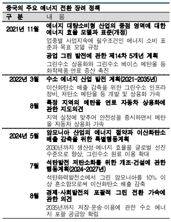 다만, 중국은 그린·저탄소 배출형 메탄올 및 암모니아 내수시장이 성숙하지 않은 편이다.