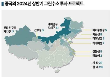 China Orange Research Institute에 따르면, 중국은 2024년 상반기에 계획 발표부터 체결, 착공, 완성 등 총 115건의 그린수소 프로젝트가 발표됐으며 수소 생산능력이 최소 390만톤에 달하고 있다..