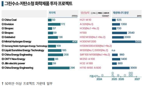 중국에서는 그린수소와 그린수소 베이스 저탄소형 메탄올(Methanol), 암모니아(Ammonia) 투자가 폭발적으로 증가하고 있으며, 일부 저탄소형 원료 및 연료는 수출을 통해 글로벌 에너지 전환에 기여할 것으로 예상된다.