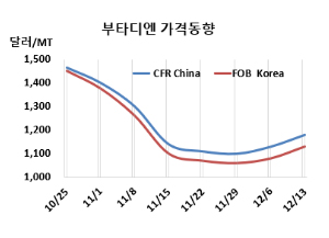 부타디엔(Butadiene)은 상승했다. 부타디엔 시세는 12월13일 FOB Korea가 톤당 1130달러, CFR SE Asia는 1100달러로 각각 50달러 상승했다. 중화권도 CFR China는 1180달러로 50달러, CFR Taiwan도 1170달러로 50달러 치솟았다. 최근 올해 최소 수준까지 떨어졌으나 지난주를 기점으 |