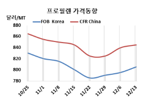 프로필렌(Propylene)은 상승했다. 프로필렌 시세는 12월13일 FOB Korea가 톤당 805달러로 10달러 상승했지만, CFR SE Asia는 825달러로 변동이 없었다. 중화권은 CFR China는 845달러, CFR Taiwan는 835달러로 각각 5달러 올랐다. |