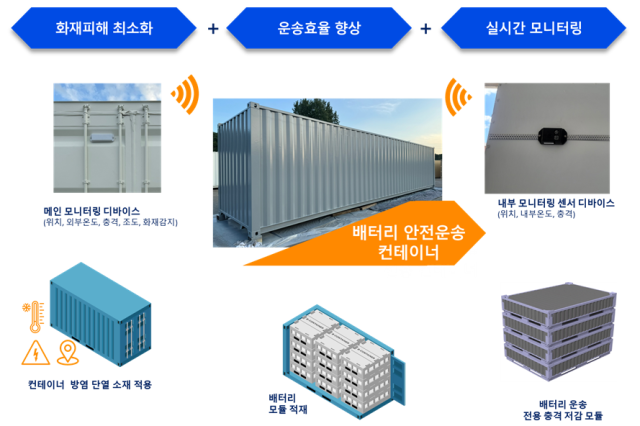 스마트 컨테이너는 방염·단열 기능과 블록체인 기반 모니터링 시스템을 갖추고 있으며 LiB 운송 과정에서 필요한 안정성 보장을 위해 일정 온도 유지, 충격 저감, 상시 상태 모니터링 등을 지원하는 것이 특징이다.