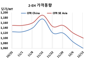 옥소알코올(Oxo-Alcohol)은 하락했다. 2-EH(Ethylhexanol)는 12월13일 CFR China가 톤당 1060달러로 25달러, CFR SE Asia는 1100달러로 20달러 하락했다. |