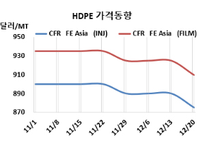 HDPE(High-Density Polyethylene)는 하락했다. HDPE 시세는 12월18일 인젝션(Injection) 그레이드 기준 CFR FE Asia가 톤당 875달러로 15달러 하락했고, CFR SE Asia는 950달러로 변동이 없었다. 블로우몰딩(Blow-Molding)도 FEA가 890달러로 15달러 떨어졌고, |