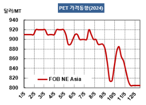 PET(Polyethylene Terephthalate)는 하락했다. 병(Bottle) 그레이드 PET 시세는 12월24일 FOB NE Asia가 805달러, FOB SE Asia는 895달러로 변동이 없었다. |