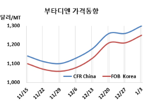 부타디엔(Butadiene)은 상승했다. 부타디엔 시세는 1월3일 FOB Korea가 톤당 1250달러로 40달러 상승했지만, CFR SE Asia는 1180달러로 변동이 없었다. 중화권은 CFR China는 1300달러로 40달러 올랐지만, CFR Taiwan은 1250달러로 보합세에 그쳤다. |