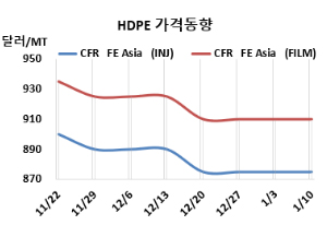 HDPE(High-Density Polyethylene)는 보합세에 그쳤다. HDPE 시세는 1월8일 인젝션(Injection) 그레이드 기준 CFR FE Asia가 톤당 875달러, CFR SE Asia는 935달러로 변동이 없었다. 블로우몰딩(Blow-Molding)도 FEA가 890달러, SEA는 935달러로 보합세에 |
