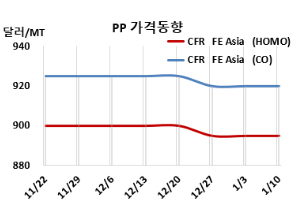 PP(Polypropylene)는 변동이 없었다. 아시아 PP 시세는 1월8일 CFR FE Asia 기준 라피아(Raffia) 및 인젝션(Injection) 그레이드가 톤당 895달러, IPP Film 및 BOPP는 905달러, 블록 코폴리머(Block Copolymer)는 920달러로 변동이 없었다. CFR SE Asia도 라피아 및 인젝션 95 |