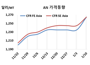 AN(Acrylonitrile)은 상승했다. AN 시세는 1월10일 CFR FE Asia 1265달러로 30달러, CFR SE Asia는 1265달러로 20달러 상승했다. CFR S Asia는 1290달러로 10달러 올랐다. 유럽은 CIF MED 1490달러로 15달러 상승했다. |