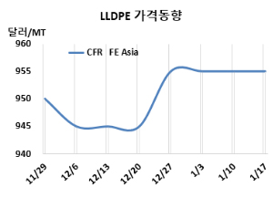 LLDPE(Linear Low-Density Polyethylene)는 동남아‧인디아가 상승했다. LLDPE 시세는 1월15일 CFR FE Asia가 톤당 955달러로 변동이 없었고, CFR SE Asia는 980달러 20달러 상승했다. CFR India도 930달러로 20달러 올랐다. 유럽은 1월17일 FD NWE 1090유로로 50유로 상승했다 |